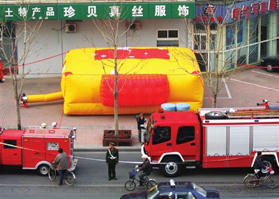 事發(fā)兩廣路與祈年大街路口西南角的珍貝大廈樓頂。記者9點多趕到時,消防員已在樓下充起氣墊,四周都拉起警戒線,有民警及交警疏散圍觀群眾。該樓高6層,樓頂立有4個一米高的漢字招牌,兩名中年女子就扶著鐵架,面對面騎坐在“大”、“廈”兩個招牌的旁邊,此時,兩人已在此坐了近兩個小時。據(jù)知情人透露,這兩名女子一名叫郭麗娜,吉林人,一名叫于秀敏,山東人,因錢在北京被搶而想不開,二人于近日認(rèn)識。一名大廈的工作人員稱,頂層的大門一直是鎖著的,不知道這兩名女子如何爬到那個地方。由于二人脖子上均拴著繩子,如果墜下很可能發(fā)生危險,且她們所處的位置有障礙物阻擋,給民警的救援工作帶來困難。