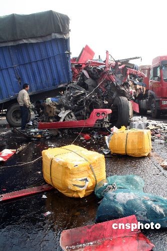 11月14日6時(shí)30分,由于受團(tuán)霧影響,滬昆高速江西東鄉(xiāng)縣195KM--196KM處往南昌方向同時(shí)間發(fā)生5起汽車追尾事故,造成16輛貨車追尾,高速公路交通一度受阻。據(jù)了解,事故已造成5人死亡、10人受傷。經(jīng)過(guò)當(dāng)?shù)赜嘘P(guān)部門全力搶救,到上午10時(shí),滬昆高速公路事故路段實(shí)行交通疏導(dǎo)分流,恢復(fù)部分交通,目前事故還在進(jìn)一步清理調(diào)查中。中新社發(fā) 何江華 攝