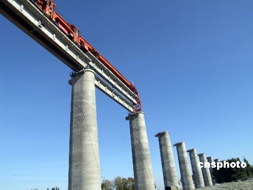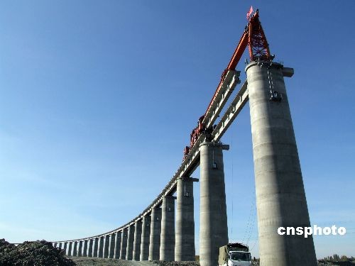 11月中旬,新建北疆鐵路奎北段奎屯河特大橋勝利架通。該橋全長6.9公里,共需架梁209孔,這也是迄今新疆境內(nèi)鐵路的第一長橋。 建成后將填補(bǔ)北疆地區(qū)空白,是我國連接中西亞和歐洲鐵路運(yùn)輸大通道的重要組成部分。 又由于克拉瑪依是我國目前惟一不通鐵路的石油基地,也是在建的西北最大的石化基地。北疆鐵路奎北段的盡快修通,對克拉瑪依在今后幾年能夠迅速形成更大的煉油加工能力至關(guān)重要,同時對新疆早日成為我國石油工業(yè)最為現(xiàn)實(shí)的戰(zhàn)略接替區(qū)也非常關(guān)鍵。中新社發(fā) 杜芳棟 攝