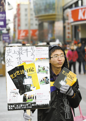 11月18日,長(zhǎng)春市寒風(fēng)凜冽,而在重慶路上卻有這樣一位衣著單薄的人引起過往行人的注意:他身高約1.7米左右,赤裸的雙腳只靠一雙棉拖鞋阻擋風(fēng)寒,他的右手舉著一個(gè)寫著“史上最牛乞丐簽售”字樣的牌子,左手提著一個(gè)粉色布袋子,手中還舉著一本名為《乞討日記》的書,步履蹣跚地行走著。他,就是名噪一時(shí)的“史上最牛乞丐”夏海波。