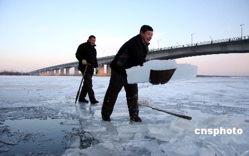 11月20日,哈爾濱公路大橋西側黑龍江省冬泳協(xié)會冰窟池,游泳會長王利敏在冰窟窿里撈冰,準備按計劃鑿開一個長50米,寬20米的冬泳池。中新社發(fā) 姚庭山 攝