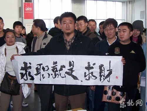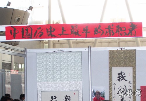 11月22日在哈爾濱國際會展中心舉辦的大型招聘會上,一個掛滿字畫的展位引起眾人和媒體的注意,并非招聘而是求職,展位中一位近四十歲的男子自詡“史上最牛的求職者”,大膽放言“給我5000元,使你成為百萬富翁”,在眾多企業(yè)當(dāng)中周旋著尋找自己的伯樂,而這位“最牛求職者”對伯樂的要求還挺高,必須是女性,而且是越年輕越漂亮越好。并對記者稱,希望同時為四位雇主服務(wù),減少不良雇主對他的傷害。