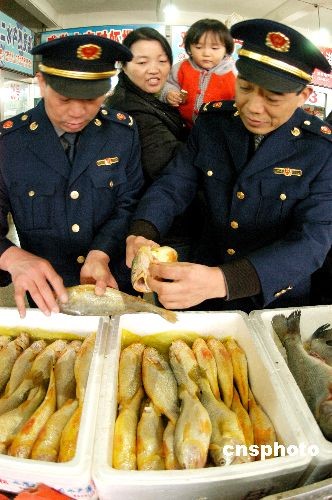 11月24日,連云港市連云工商分局針對海鮮市場出現(xiàn)有毒染色黃魚的現(xiàn)象,組織執(zhí)法人員進(jìn)行了突擊檢查,檢查中發(fā)現(xiàn)一些不法商販在出售“美容”黃魚。中新社發(fā) 王春 攝