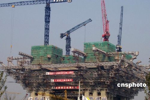 2008年11月25日,正在建設(shè)中的上海世博會中國館已初露雄姿,據(jù)悉計劃2009年年底竣工。 中新社發(fā) 周東潮 攝