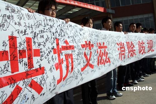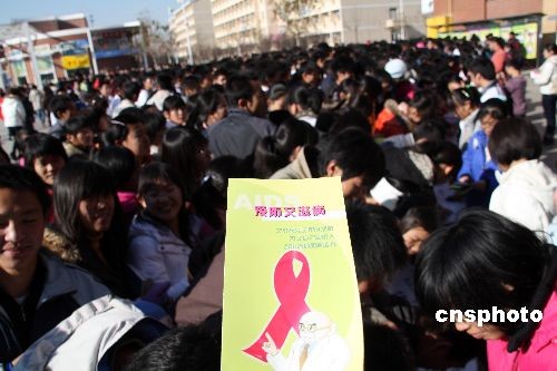 2008年11月28日上午,山東濱州學(xué)院大學(xué)生舉著印有“攜手同行,共抗艾滋,消除歧視,共享健康”的條幅。當(dāng)日,在世界艾滋病日來臨前夕,濱州紅十字會與濱州學(xué)院聯(lián)合舉辦了此次簽名活動,吸引了學(xué)院萬余名大學(xué)生熱情參與。中新社發(fā) 郭志華 攝