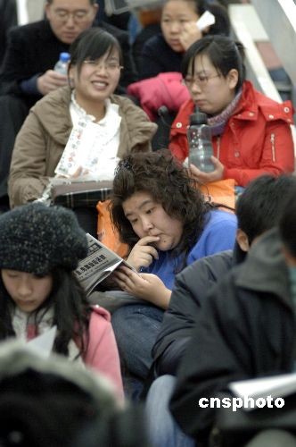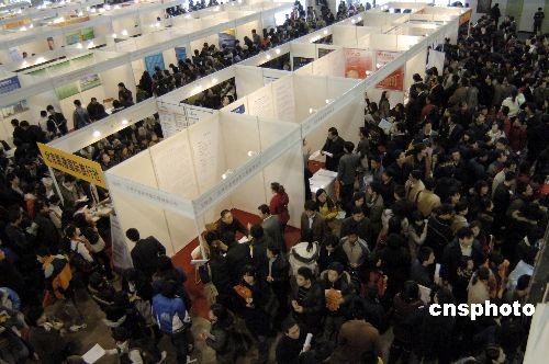 11月29日,大型部委聯(lián)合招聘會(huì)在北京中國(guó)國(guó)際展覽中心舉行,中科院、時(shí)代集團(tuán)、中國(guó)日?qǐng)?bào)社、百度等700多家單位招攬人才,近萬(wàn)個(gè)工作崗位令求職者趨之若騖。據(jù)悉,金融危機(jī)下的就業(yè)形勢(shì)不容樂(lè)觀(guān),許多應(yīng)屆畢業(yè)大學(xué)生主動(dòng)降低薪酬期望值,以期盡快就業(yè)。中新社發(fā) 徐曦弋 攝
