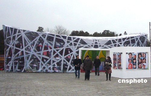 2008年12月3日,由噴繪布模擬搭建的山寨版“鳥巢”展廳正式在北京地壇書市的方澤壇活動區(qū)亮相,游客競相入內參觀。不過這個建筑可不是用來進行體育比賽的,本屆書市的展覽、法律咨詢等活動都在這里進行。中新社發(fā) 玉龍 攝