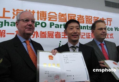 12月5日,中國2010年上海世博會首批境外參展者完成主體登記,獲頒證照。此舉標(biāo)志著上海世博會面向全球的參展服務(wù)啟動。圖為荷蘭展區(qū)總代表魏偉勵(左一)、盧森堡展區(qū)副總代表費(fèi)瑞朋(右一)等從上海官員手中接過營業(yè)執(zhí)照等。中新社發(fā) 許曉青 攝