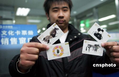12月6日,北京市地鐵運(yùn)營公司開始發(fā)行4000冊紀(jì)念文化卡票,每冊280元,這是北京軌道交通運(yùn)營38年來首次發(fā)行紀(jì)念文化卡票。除機(jī)場線4個站外,北京地鐵7條線的119個站點(diǎn)將同時發(fā)售紀(jì)念卡票。紀(jì)念卡票特邀韓美林擔(dān)綱設(shè)計,冊內(nèi)收藏北京地鐵紀(jì)念文化卡票4張,設(shè)計以“奧運(yùn)與地鐵”文化創(chuàng)意為主線,選農(nóng)歷戊子年“鼠”為首頁,以“熊貓、耕牛、駿馬”為圖,分別呈現(xiàn)“和諧、平安、耕耘、開拓”。中新社發(fā) 富田 攝