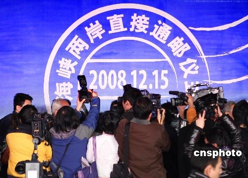 12月15日,由國家郵政局、國務(wù)院臺灣事務(wù)辦公室、北京市政府主辦、中國郵政集團承辦的海峽兩岸直接通郵儀式,標志著海峽兩岸將實現(xiàn)全面、直接、雙向通郵,直接開辦各項郵政業(yè)務(wù)。大陸方面郵件封局為北京、上海、廣州、福州、廈門、西安、南京、成都,臺灣方面郵件封局為臺北、高雄、基隆、金門、馬祖。圖為通郵儀式吸引眾多境內(nèi)外記者爭相采訪。中新社發(fā) 宋吉河 攝
