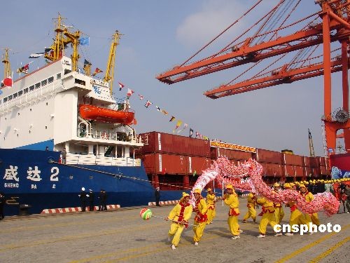 12月15日上午,廈門港4艘集裝箱貨輪“盛達2”輪、“錦春”輪、“曉江”輪、“華航1”輪,在人們的喝彩聲中緩緩啟航,直航高雄港、臺中港、基隆港。從1997年4月開始獲準開通對臺“試點直航”、積累了10多年對臺航運經驗的廈門港從此升級。中新社發(fā) 楊伏山 攝