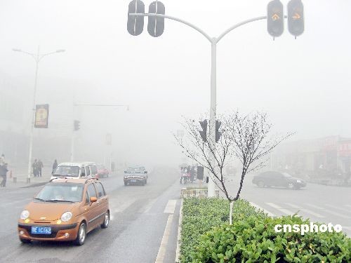 2008年12月16日,一場罕見的大霧籠罩著湖北宜昌,從清晨到上午10時(shí)許,城區(qū)白天如夜晚,汽車需亮燈才能看見道路。長江上的能見度達(dá)不到通航條件,影響通航3個(gè)多小時(shí)。中新社發(fā) 韓玉洪 攝