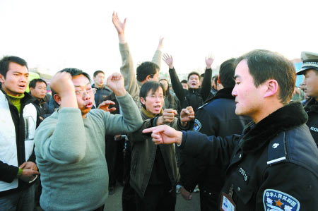 雙方中間,則有20多名民警維持秩序,不時(shí)地將撕扯的雙方拉開,場面一度十分混亂。