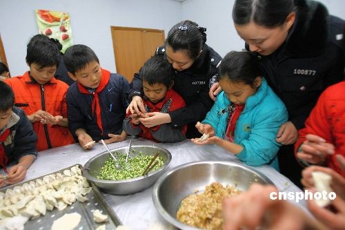 12月21日,中國農(nóng)歷“冬至”,中國北方地區(qū)有冬至吃餃子、吃餛飩的習俗。鄭州女警把在當?shù)匦W讀書的四川地震災區(qū)孩子接到警營一起包餃子,歡度這一傳統(tǒng)節(jié)氣,并帶他們參觀警營。中新社發(fā) 慎重 攝