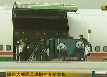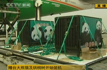 贈臺大熊貓“團團”、“圓圓”23日飛赴臺灣。大陸有關(guān)部門在成都雙流機場舉辦“贈臺大熊貓及珙桐樹赴臺歡送儀式”,目前儀式已結(jié)束,開始裝運大熊貓和珙桐樹。
