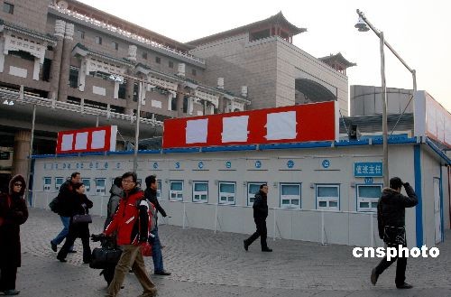 12月26日,北京西站廣場(chǎng)上搭建起“臨時(shí)售票窗口”,為2009年春運(yùn)做準(zhǔn)備。2009年春運(yùn)將從元月11日至明年2月19日結(jié)束,為期40天。今年春運(yùn)的特點(diǎn)是學(xué)生流和民工流探親流三流重疊,春運(yùn)壓力空前集中。針對(duì)近日來(lái)迅猛增長(zhǎng)的節(jié)前客流,為方便旅客購(gòu)票,春運(yùn)期間北京站和西站會(huì)將在站前廣場(chǎng)開(kāi)辟臨時(shí)售票窗口,方便旅客購(gòu)票。中新社發(fā) 鄭雄增 攝