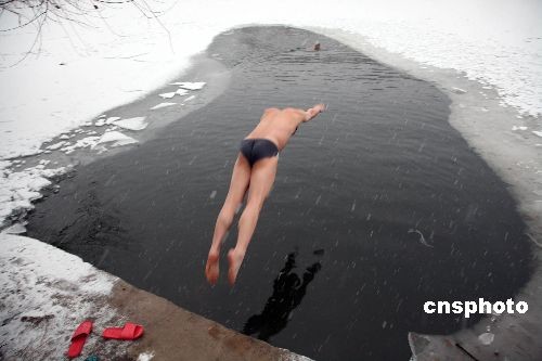 12月下旬,沈陽市北陵公園人工湖,一批冬泳愛好者換上泳衣,在刺骨的寒風(fēng)中面對泛著冰碴的湖水一躍而下演繹出美麗“凍”人的一幅畫面。一名老冬泳愛好者告訴記者,冬泳開始練習(xí)時難免有些困難要克服,但克服困難后的樂趣是普通人無法體會的,“希望更多的年輕人加入到這個隊伍中,可以鍛煉我們整個民族的意志。”中新社發(fā) 黃金昆 攝