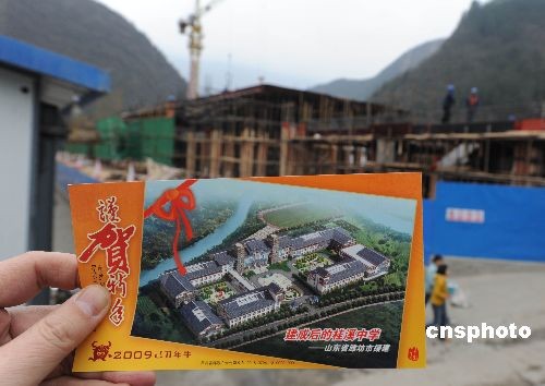 胡總書(shū)記12月27日到北川縣桂溪中學(xué)考察看望時(shí),一位羌族女學(xué)生向臨告別時(shí)的總書(shū)記送上一封信和這張學(xué)校震后重建規(guī)劃圖的賀年片。圖為羌族學(xué)生展示送給胡總書(shū)記的賀年片。中新社發(fā) 賈國(guó)榮 攝