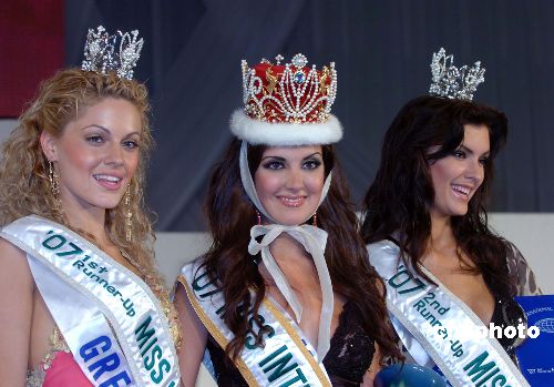 10月15日晚上,2007年國際小姐選美大賽決賽在日本東京舉行,六十一位佳麗參加角逐。經(jīng)過民族服裝、泳裝和晚禮服等項(xiàng)目激烈的競爭,最終2007年國際小姐由墨西哥小姐Priscilla Perales獲得,亞軍由希臘小姐Despoina Vlepaki獲得,而季軍則由白俄羅斯小姐Yuliya Iindzeyeva摘取。來自中國香港的香港小姐王君馨獲得2007國際友誼小姐的獎(jiǎng)項(xiàng)。中新社發(fā) 滕劍峰 攝