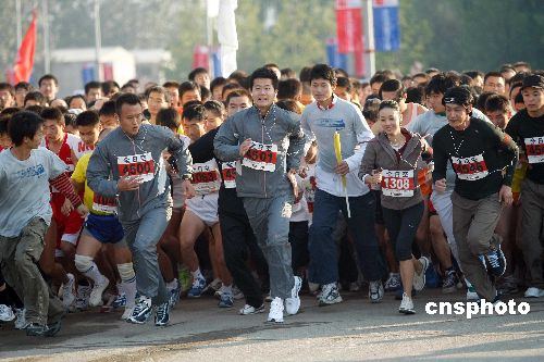 十月二十一日,2007年全日空北京國際馬拉松賽在北京國家奧林匹克體育中心鳴槍開跑,陸毅、馬伊俐等影視演員以及北京國安足球隊隊員徐云龍等參加了馬拉松比賽。中新社發(fā) 盛佳鵬 攝