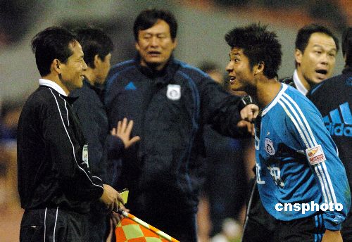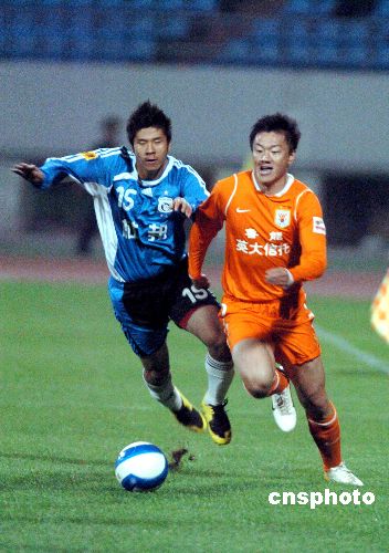 11月1日,2007中國(guó)足球超級(jí)聯(lián)賽第27輪在山東濟(jì)南的一場(chǎng)比賽中,主場(chǎng)作戰(zhàn)的山東魯能泰山隊(duì)1比1戰(zhàn)平大連實(shí)德足球隊(duì)。中新社發(fā) 張侃 攝