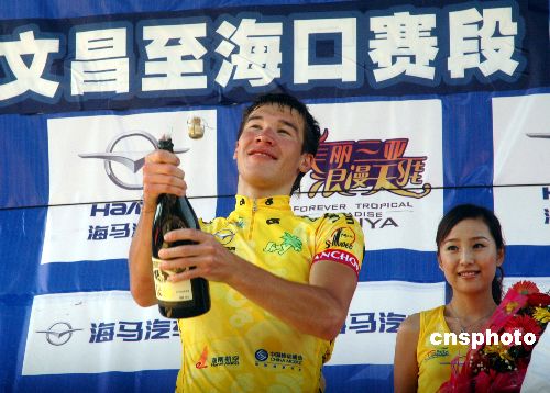 11月6日,2007年環(huán)海南島國(guó)際公路自行車賽進(jìn)行了第三賽段文昌至?125公里的比賽,俄羅斯隊(duì)車手丹尼斯·格林姆西亞諾夫以2小時(shí)55分13秒的成績(jī)獲得該賽段冠軍,并以11小時(shí)10分50秒的成績(jī)獲得個(gè)人總成績(jī)第一名,繼續(xù)保有黃色領(lǐng)騎衫。中新社發(fā) 善平 攝