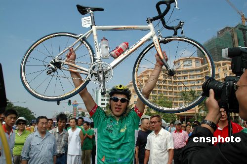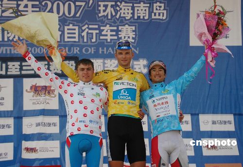 十一月十日,“海馬汽車”二00七環(huán)海南島國際公路自行車賽結(jié)束了所有的比賽,波蘭隊車手羅伯特·仁多士以二十六小時四十分四十八秒的總成績獲得個人總成績冠軍,他還獲得了第七賽段五指山至三亞分賽段冠軍和沖刺王。日本隊車手岡崎和也以二十六小時四十一分二十一秒的成績獲得亞洲最佳。俄羅斯隊車手米海勒·安德諾夫穿上了象征爬山王的圓點衫。波蘭隊還獲得了本屆賽事的團(tuán)體冠軍,成為本屆比賽的最大贏家。中新社發(fā) 尹海明 攝