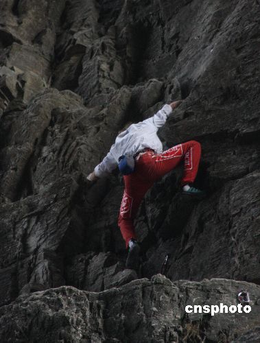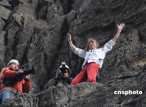 11月18日,法國(guó)“蜘蛛人”阿蘭·羅伯特經(jīng)過近1個(gè)小時(shí)的無(wú)保護(hù)徒手攀登,成功登上湖南張家界天門山天門洞左側(cè)高度約200米的巖壁,順利完成挑戰(zhàn)天門洞的計(jì)劃。中新社發(fā) 郭國(guó)權(quán) 攝