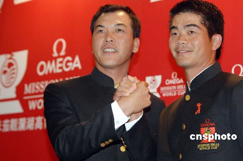 中國著名球手張連偉/梁文沖十一月二十一日在觀瀾湖東莞會所出席媒體見面會,代表中國隊征戰(zhàn)二〇〇七歐米茄觀瀾湖高爾夫世界杯。張連偉表示:我們這次在國內(nèi)參加高爾夫世界杯感到很溫暖。中新社發(fā) 陳文 攝