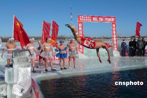 1月27日,黑河市冬泳俱樂部、俄羅斯遠東冬泳俱樂部聯(lián)合在黑龍江畔舉辦“迎奧運,賀新春、強體魄、促和諧”為主題的系列體育競賽活動。當日,黑河冬泳俱樂部的隊員們身著自制的芭蕾服裝偏偏起舞,他們還和俄羅斯遠東冬泳俱樂部共計200余名隊員,先后進行了“與奧運同行”沿黑龍江江堤徒步宣傳活動、雪地足球對抗賽、冬泳表演等系列體育競賽活動,表達了邊城健兒們向往2008奧運會的共同愿望和對全國人民新春佳節(jié)美好祝福。據(jù)悉,參加本次活動最大年齡的隊員為75歲。中新社發(fā) 邱齊龍 攝