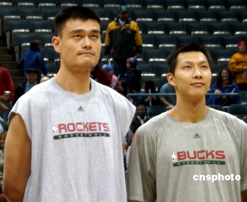 當(dāng)?shù)貢r(shí)間二月二日,由姚明領(lǐng)軍的NBA休斯頓火箭隊(duì)作客密爾沃基,挑戰(zhàn)另一位中國球員易建聯(lián)所效力的雄鹿隊(duì)。此為火箭和雄鹿在本賽季的第二次交鋒。姚明(左)和易建聯(lián)(右)賽前互致問候并合影。中新社發(fā) 李靜 攝