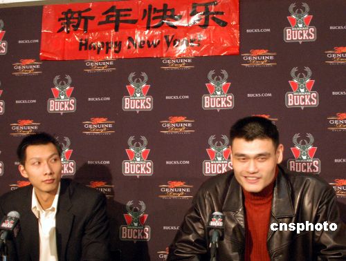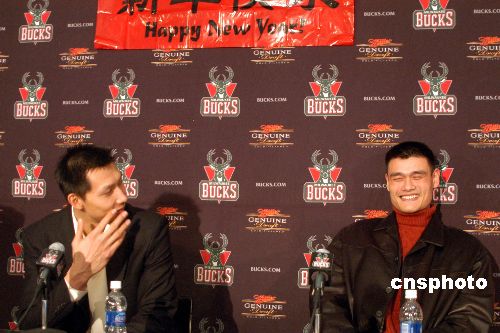 當(dāng)?shù)貢r(shí)間二月二日,姚明率領(lǐng)休斯敦火箭隊(duì)作客密爾沃基布拉德利球館,最終火箭隊(duì)以九十一比八十三險(xiǎn)勝另一名中國(guó)球員易建聯(lián)所在的雄鹿隊(duì),獲得三連勝。賽后兩位“中國(guó)德比大戰(zhàn)”的主角在雄鹿隊(duì)特地安排的聯(lián)合記者會(huì)上談笑風(fēng)生,一同向中國(guó)球迷致以新春祝福。中新社發(fā) 李靜 攝
