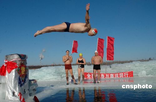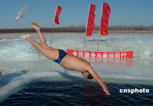 2月7日,黑龍江黑河市冬泳俱樂部與俄羅斯布拉戈維申斯克市冬泳俱樂部的30多名隊員,在黑河市中俄界江冒著零下30度的嚴寒,以冬泳方式歡度新春佳節(jié)。中新社發(fā) 邱齊龍 攝