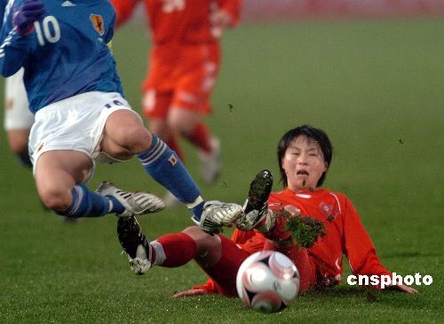 2008年2月18日,東亞女子足球錦標(biāo)賽在重慶永川體育中心體育場(chǎng)開(kāi)戰(zhàn)。日本隊(duì)以3比2勝朝鮮隊(duì),爆出本賽事一冷門(mén)。中新社發(fā) 吳峻 攝