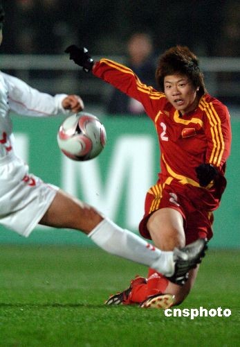 2008年2月21日晚,東亞女子足球錦標(biāo)賽第二輪在重慶永川體育中心體育場進(jìn)行。終場中國隊(duì)在少一人的情況下以0比0戰(zhàn)平朝鮮隊(duì)。中新社發(fā) 吳峻 攝