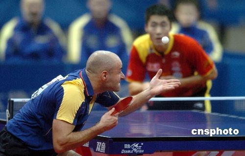 2月25日晚,第49屆世乒賽團(tuán)體賽進(jìn)入第二天的爭奪,中國男隊迎戰(zhàn)小組賽中的羅馬尼亞隊。王勵勤在首場比賽中以1比3負(fù)于世界排名97位的菲利蒙。中國隊出場的另外兩運(yùn)動員陳玘和王皓分別戰(zhàn)勝對手,最終中國隊3比1勝羅馬尼亞隊。中新社發(fā) 吳峻 攝