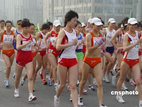 三月十五日,2008年全國(guó)競(jìng)走大獎(jiǎng)賽的女子成年組、青年組二十公里競(jìng)走比賽在鄭東新區(qū)的CBD廣場(chǎng)舉行,陜西選手蔣秋艷和陜西選手楊明霞分別獲得女子成年組和青年組二十公里競(jìng)走比賽冠軍。中新社發(fā) 李志全 攝