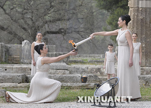 圖:圣火采集儀式上最高女祭司點(diǎn)燃火種罐