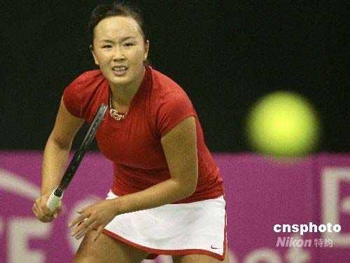 4月26日,聯(lián)合會杯網(wǎng)球賽世界杯半決賽中國隊與西班牙隊的比賽在北京國際網(wǎng)球中心進(jìn)行。在首場單打比賽中,彭帥連輸兩盤以3-6,6(4)-7不敵年僅19歲的西班牙小將納瓦羅?偙确种袊0比1暫時落后。中新社發(fā) 富田 攝