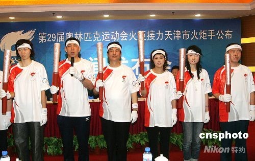 4月30日,北京第29屆奧林匹克運動會火炬接力天津市火炬手名單公布。全國勞動模范孔祥瑞(左三),當代著名作家和畫家馮驥才,天津女排主教練王寶泉,奧運會排球冠軍張娜、李珊等入選。將參加天津地區(qū)火炬接力的共有416名火炬手和85名護跑手,年齡最大的七十九歲,最小的十四歲。中新社發(fā) 孫震 攝