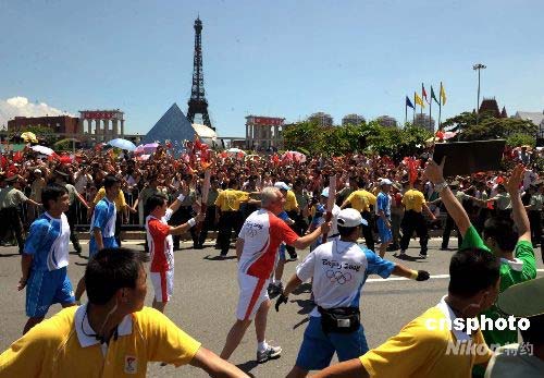 5月8日,奧運圣火在深圳進行傳遞。在深圳世界之窗門前芬蘭籍火炬手芬蘭前奧委會主任塔帕尼·愛爾卡與火炬手高正榮交接后向前傳遞圣火。中新社發(fā) 廖攀 攝