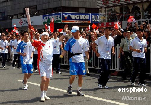 5月11日上午,福建年齡最大的火炬手,九十四歲香港籍的歐椿堃老先生正在傳遞北京奧運火炬。當日,北京奧運火炬福建站傳遞在福州來開帷幕。 中新社發(fā) 王東明 攝