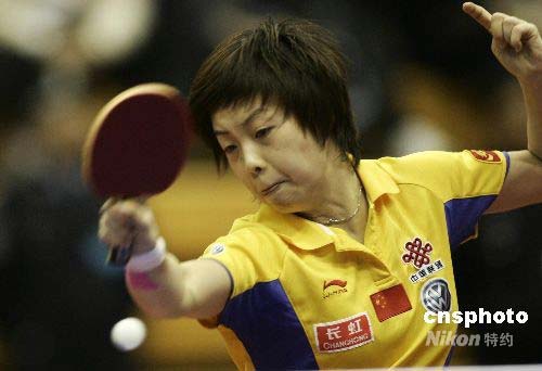 5月17日,在長春舉行的中國乒乓球公開賽女單八分之一決賽中,張怡寧戰(zhàn)勝中國香港姜華珺,殺入四強。中新社發(fā) 杜洋 攝