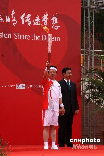 5月26日,奧運(yùn)圣火在江蘇泰州傳遞。圖為第一棒火炬手、全國(guó)道德模范張?jiān)迫治障樵苹鹁妗?中新社發(fā) 周兆軍 攝
