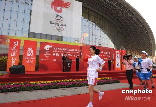 5月29日,奧運圣火在安徽淮南傳遞,中央電視臺主持人周濤領(lǐng)跑第一棒火炬。目前,周濤承擔北京奧運會和殘奧會全球電視轉(zhuǎn)播總協(xié)調(diào)工作。中新社發(fā) 廖攀 攝
