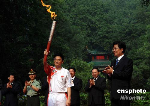 6月4日,奧運(yùn)會(huì)跳水冠軍、湖南省體育局的副局長(zhǎng)熊倪在愛(ài)晚亭前從湖南省委書(shū)記張春賢手中接過(guò)火炬,開(kāi)始奧運(yùn)圣火長(zhǎng)沙站傳遞。中新社發(fā) 廖攀 攝