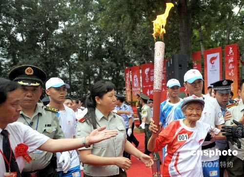 7月2日8時(shí)14分,在奧運(yùn)火炬延安傳遞的起點(diǎn)棗園,92歲的老紅軍劉天佑起跑延安火炬?zhèn)鬟f的第一棒。 中新社發(fā) 廖攀 攝
