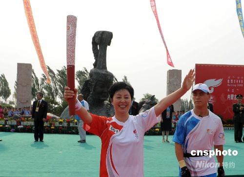 7月10日,奧運(yùn)火炬開(kāi)始在著名的紅山文化起源地內(nèi)蒙古赤峰市進(jìn)行傳遞。傳遞線路全長(zhǎng)6.1公里,起點(diǎn)為車(chē)伯爾民俗園。第一棒火炬手為赤峰第一任旅游局局長(zhǎng)、全國(guó)旅游系統(tǒng)先進(jìn)個(gè)人娜日蘇。 中新社發(fā) 廖攀 攝
