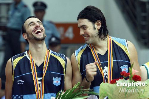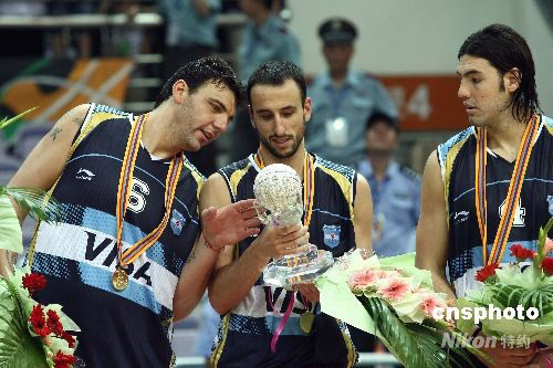 8月1日晚,國際籃聯2008鉆石杯男籃比賽的決賽在阿根廷隊與澳大利亞隊之間打響,最終阿根廷隊在第三節(jié)一度落后19分的情況下,上演大逆轉,最終以95:91戰(zhàn)勝對手,奪得冠軍。中新社發(fā) 盛佳鵬 攝