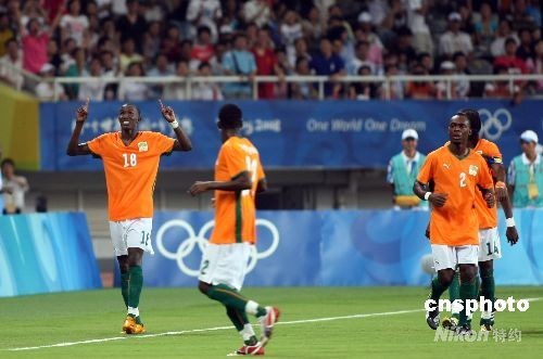 8月7日,北京奧運(yùn)會(huì)上海足球分賽場(chǎng)男足預(yù)賽,作為首次參加奧運(yùn)會(huì)足球比賽的科特迪瓦,在遭遇衛(wèi)冕冠軍阿根廷隊(duì)時(shí)毫不示弱,球員門以精湛的球技,征服現(xiàn)場(chǎng)球迷贏得掌聲。圖為科特迪瓦18號(hào)球員塞古·西塞(CISSE Sekou)進(jìn)球后歡慶。中新社發(fā) 湯彥俊 攝